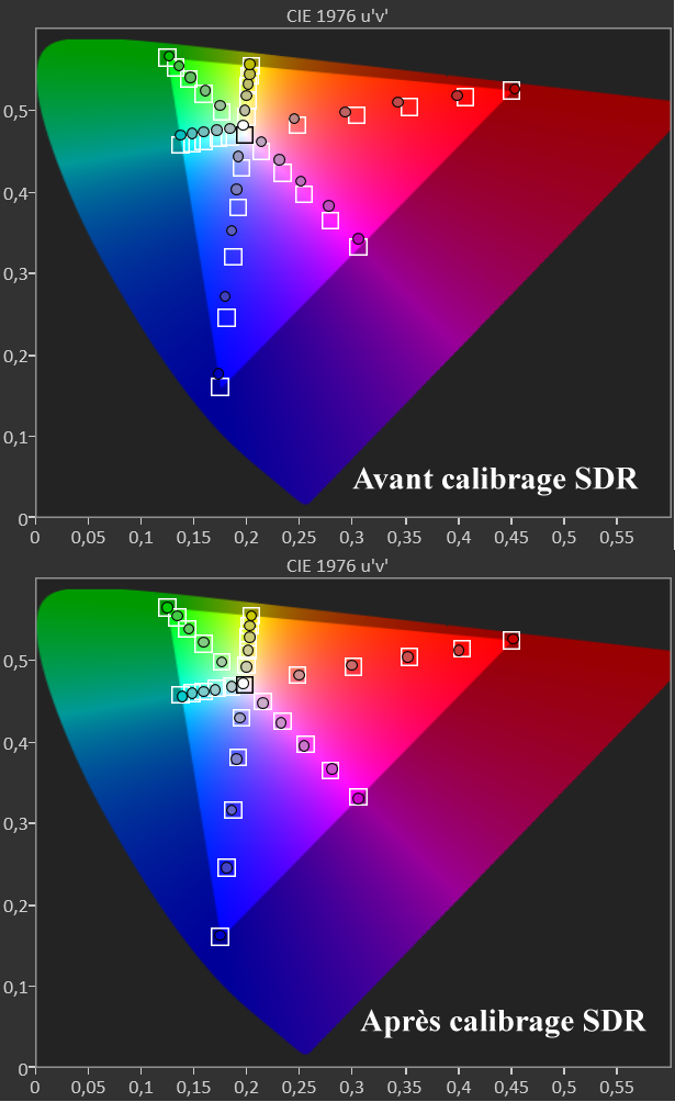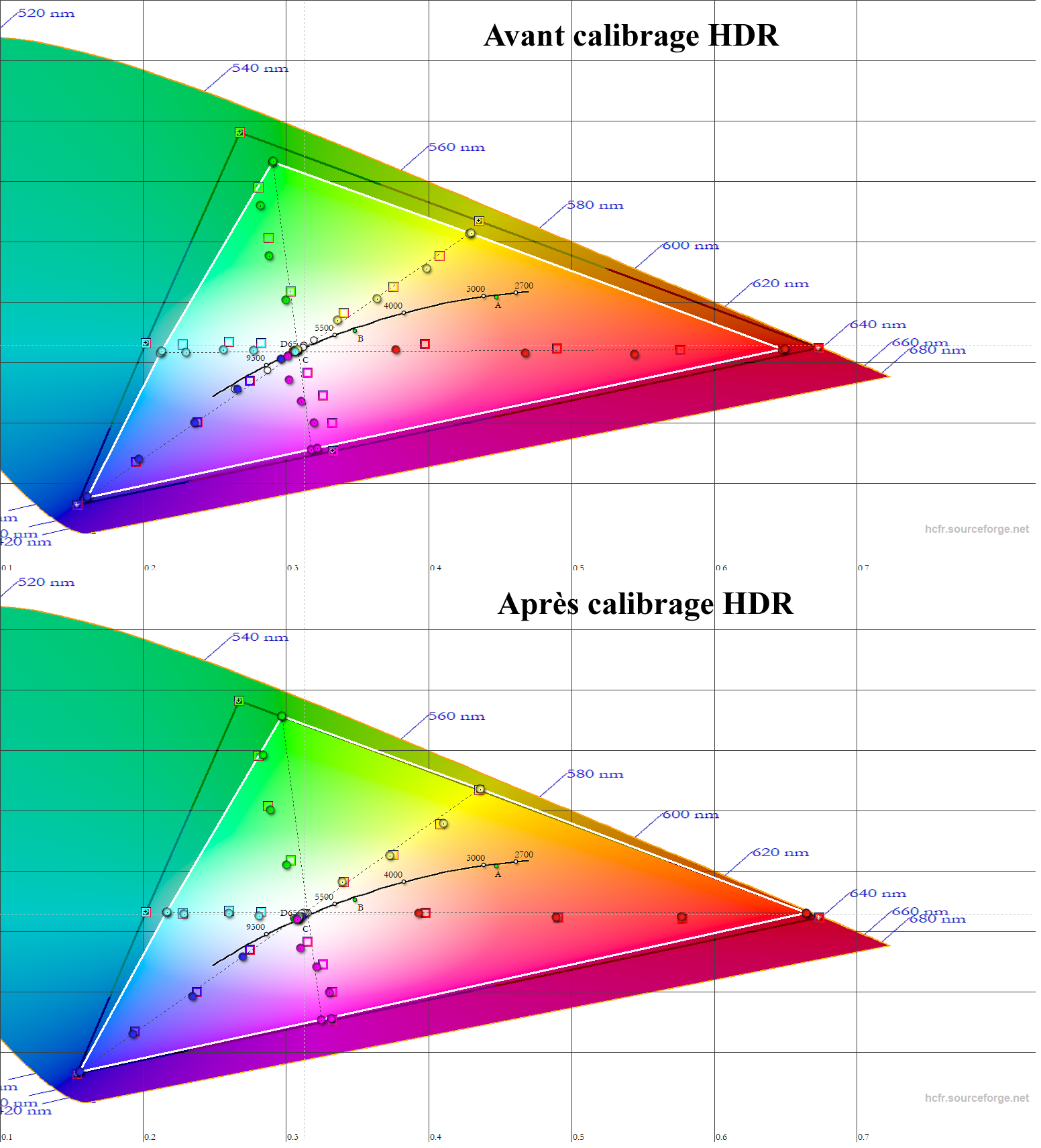 Après calibrage HDR, tous les delta E moy des couleurs passent largement sous les 2. La plage DCI-P3 (norme cinéma) est couverte à près de 95%.