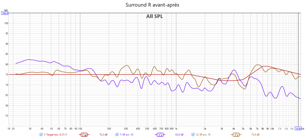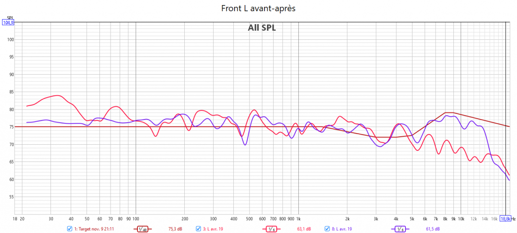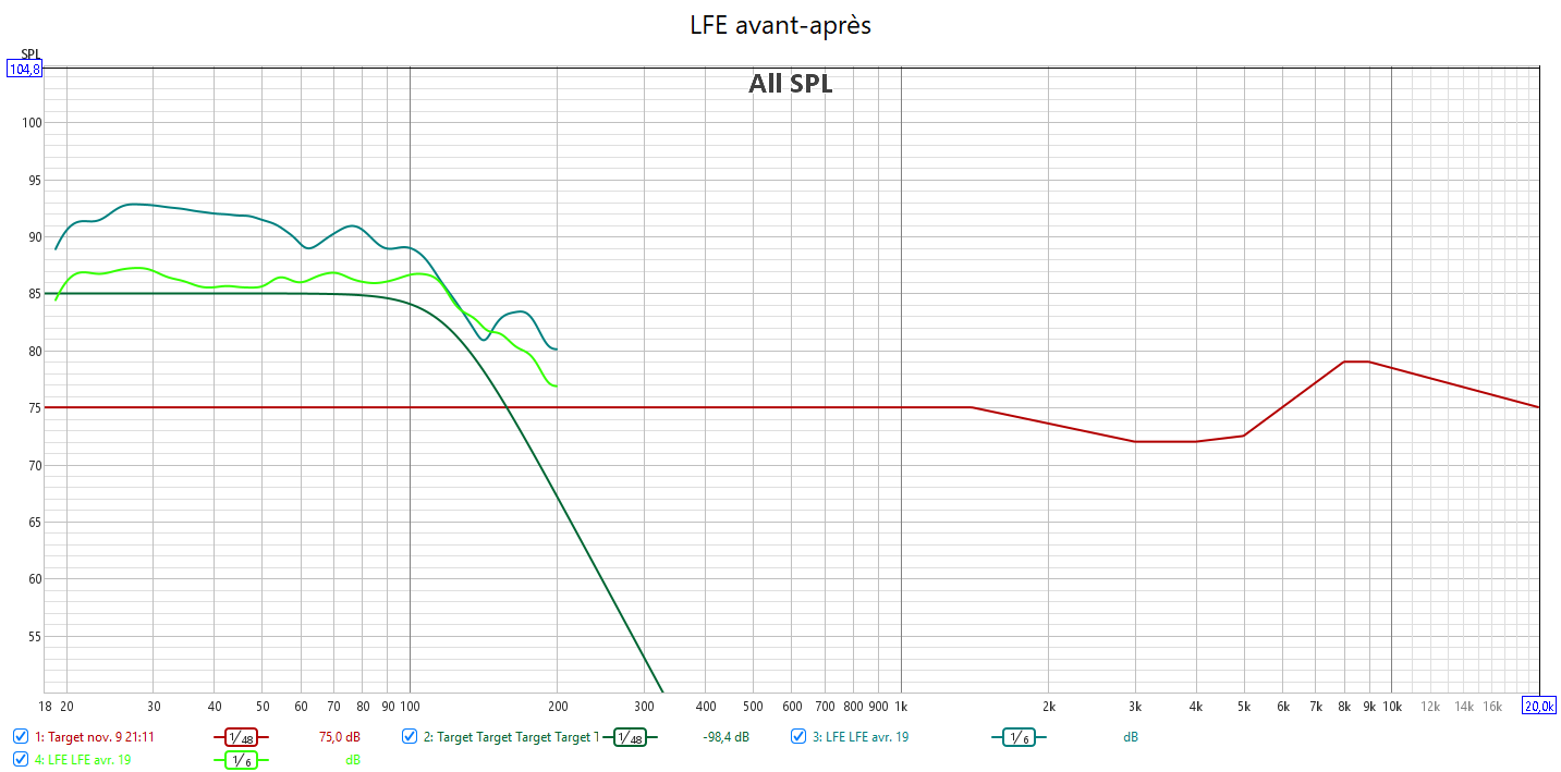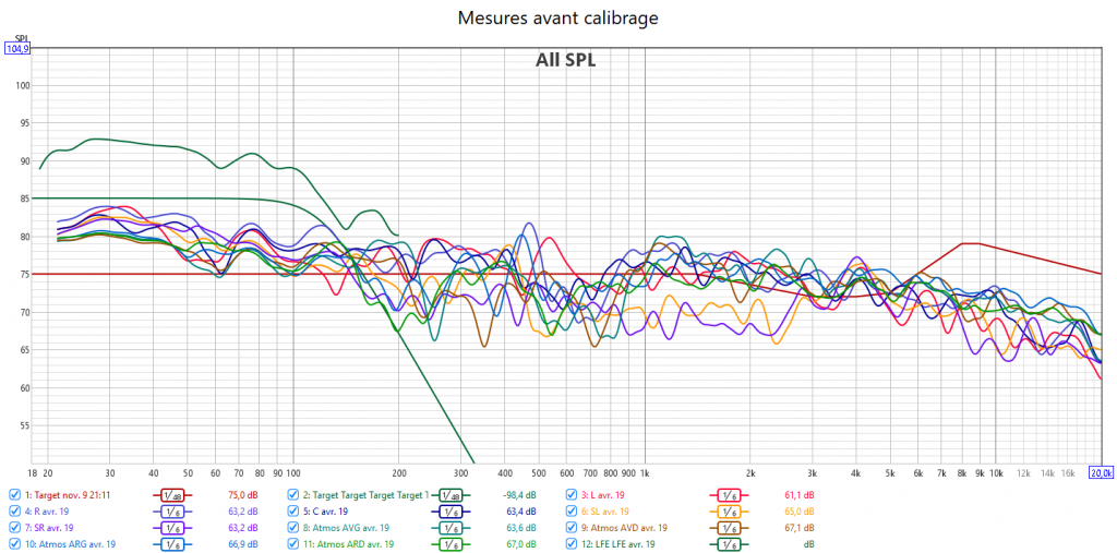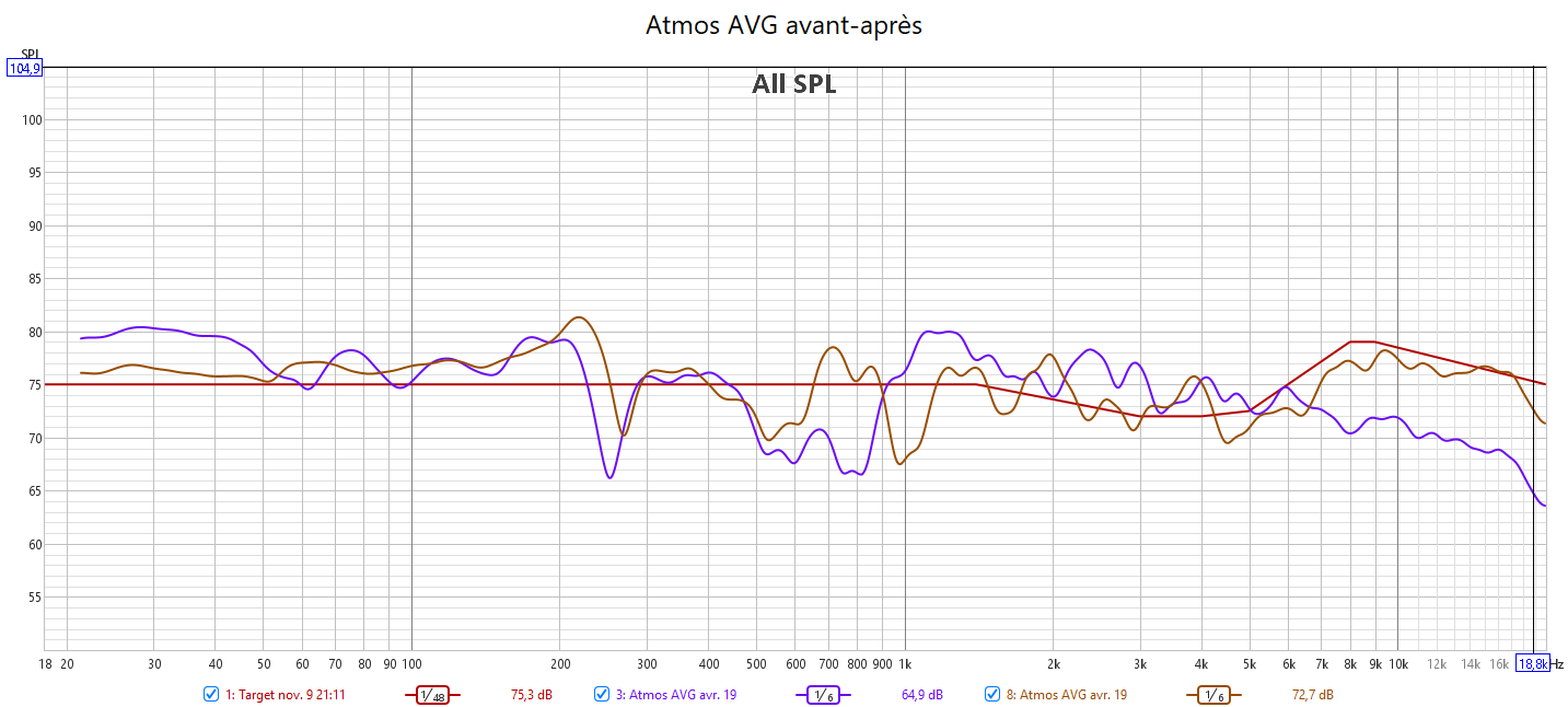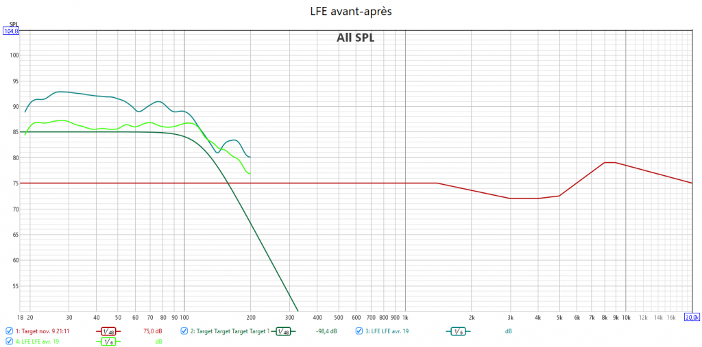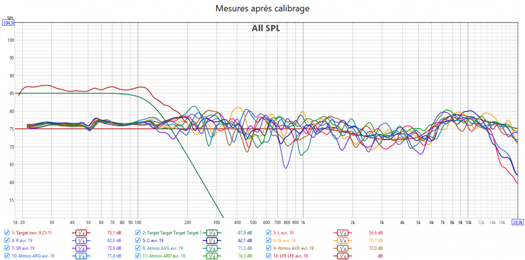 Après calibrage : Bien que conseillé à au moins 9, j’ai réduis le nombre de mesures à 5 pour couvrir la surface d’écoute réelle et éviter trop de fluctuation des réponses dans le médium et l’aigu. La réponse des enceintes suit la nouvelle courbe cible qui est appliquée pour prendre en compte la sensibilité de l’oreille suivant une extrapolation des courbes isosoniques. Les réponses sont plus homogènes, moins fluctuantes qu’avant et donc plus fidèles à la courbe cible qui assure une écoute sans agressivité et un rendu précis, détaillé et plus naturel. L’aigu étant le son le plus directif, la spatialisation monte d’un cran. La réponse dans le grave est toujours aussi bonne, voire meilleure si on consulte la réponse impulsionnelle. Je prends différents points de mesures sur la zone d’écoute (canapé 3 places) et la réponse est toujours linéaire. Il serait difficile de faire encore mieux. J’ai diminué le niveau de support au LFE des frontales en passant à -15 dB au lieu de -18 dB. Egalement pour la fréquence : soutien jusque 50 Hz mini au lieu de 40 Hz précédemment. Le niveau d’écoute impose cet ajustement. A niveau d’écoute plus bas, on aurait pu laisser comme c’était.
