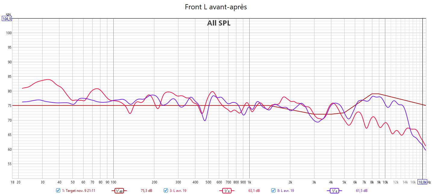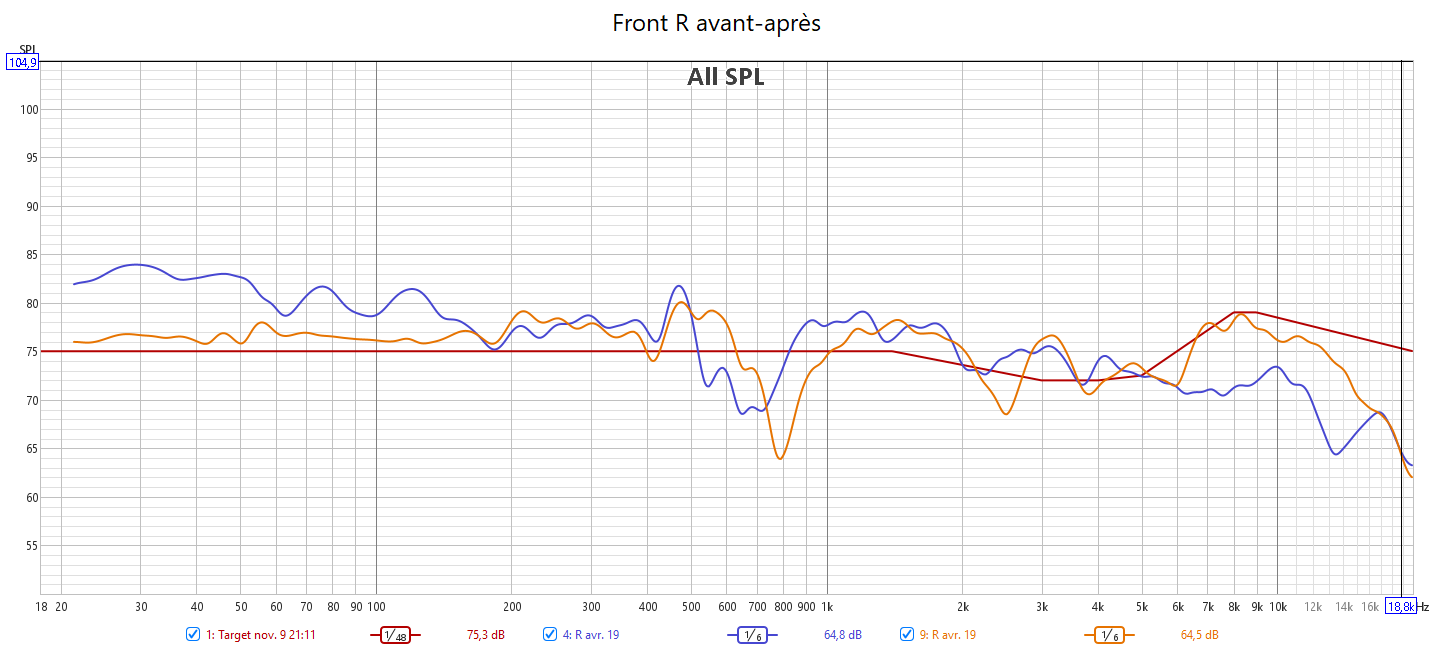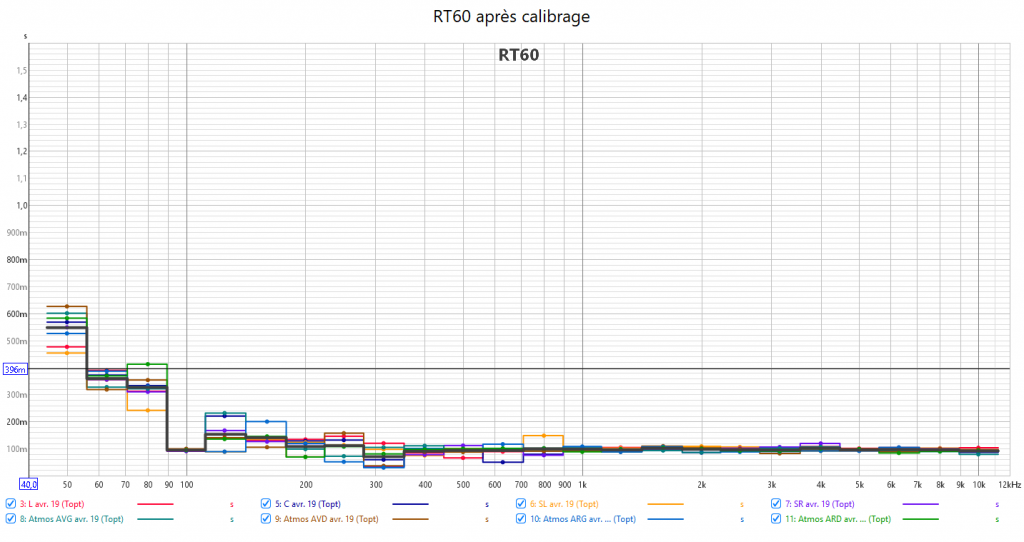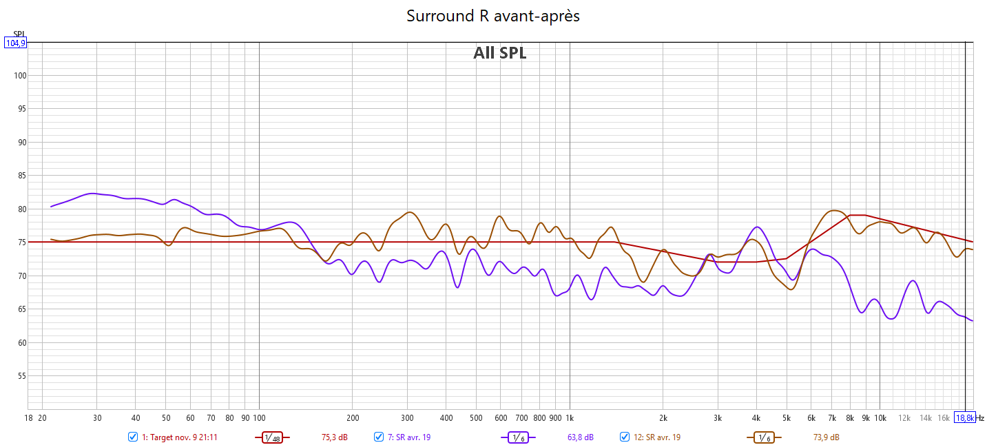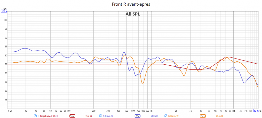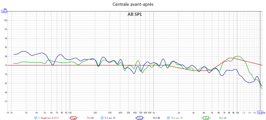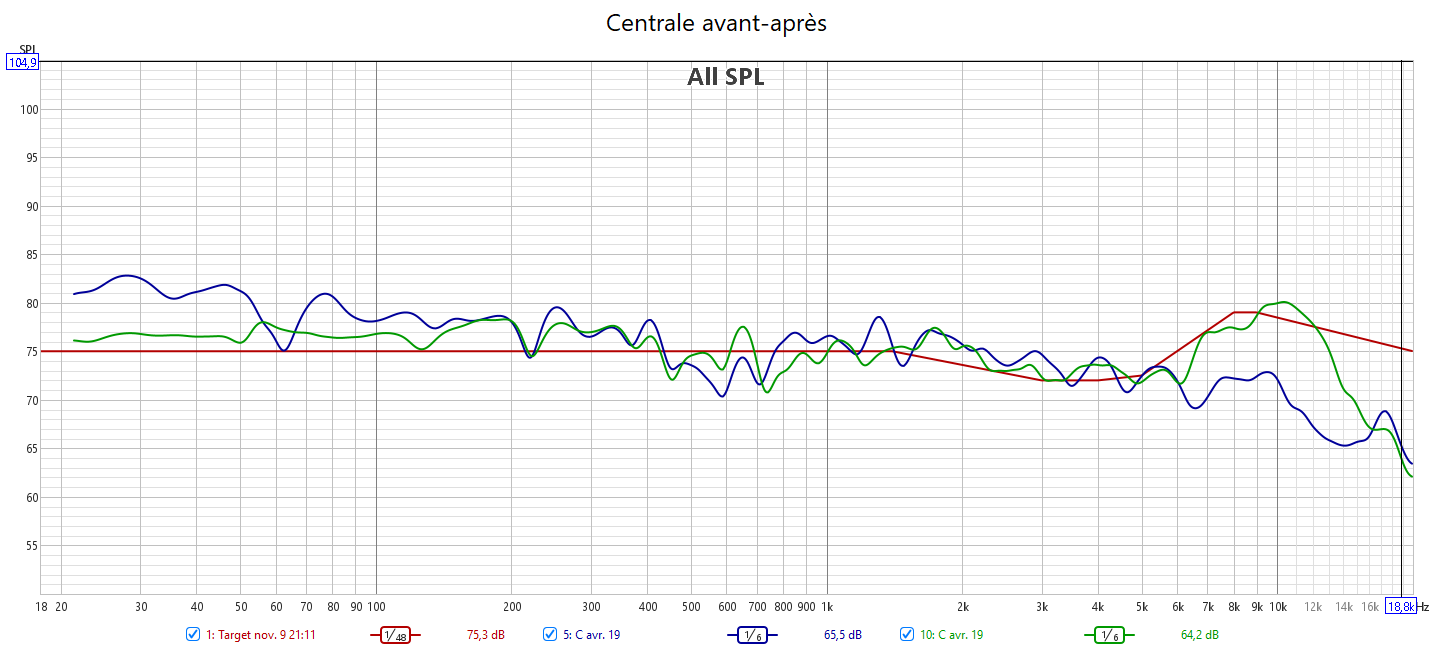 Après calibrage : Bien que conseillé à au moins 9, j’ai réduis le nombre de mesures à 5 pour couvrir la surface d’écoute réelle et éviter trop de fluctuation des réponses dans le médium et l’aigu. La réponse des enceintes suit la nouvelle courbe cible qui est appliquée pour prendre en compte la sensibilité de l’oreille suivant une extrapolation des courbes isosoniques. Les réponses sont plus homogènes, moins fluctuantes qu’avant et donc plus fidèles à la courbe cible qui assure une écoute sans agressivité et un rendu précis, détaillé et plus naturel. L’aigu étant le son le plus directif, la spatialisation monte d’un cran. La réponse dans le grave est toujours aussi bonne, voire meilleure si on consulte la réponse impulsionnelle. Je prends différents points de mesures sur la zone d’écoute (canapé 3 places) et la réponse est toujours linéaire. Il serait difficile de faire encore mieux. J’ai diminué le niveau de support au LFE des frontales en passant à -15 dB au lieu de -18 dB. Egalement pour la fréquence : soutien jusque 50 Hz mini au lieu de 40 Hz précédemment. Le niveau d’écoute impose cet ajustement. A niveau d’écoute plus bas, on aurait pu laisser comme c’était.