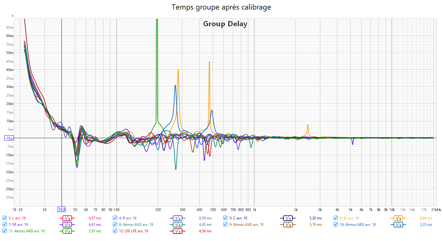 Après calibrage, le temps groupe est très bon (comme avant calibrage). Le retard du LFE étant bien compensé par Dirac.