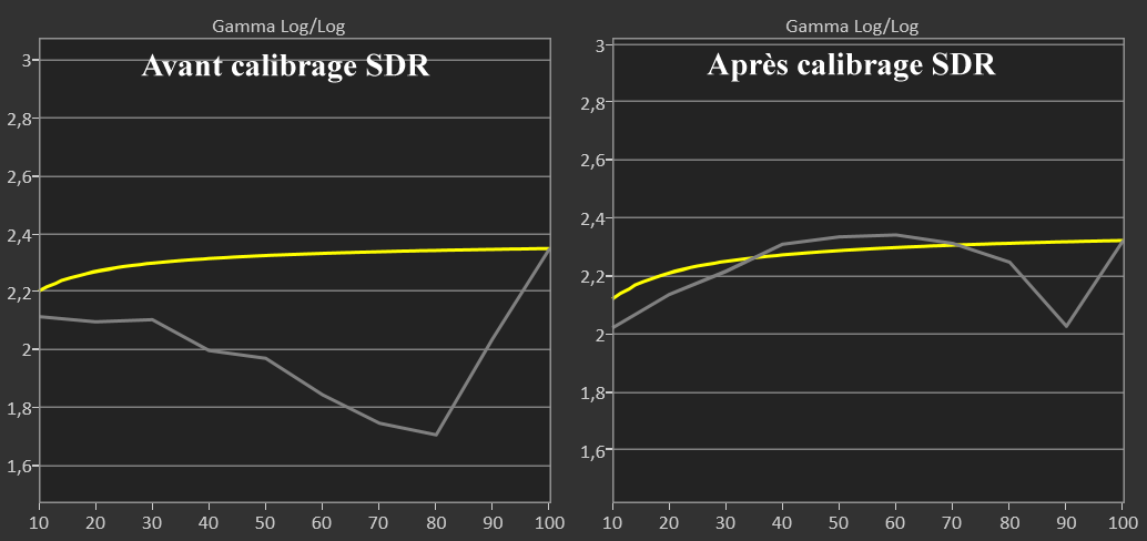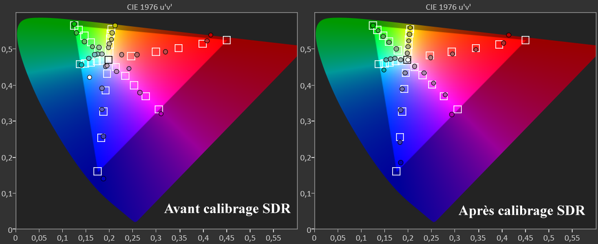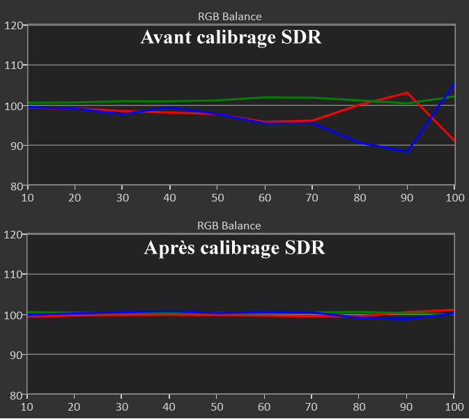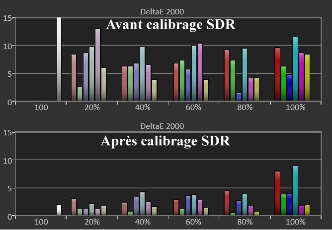 Après calibrage SDR, j’ai pu descendre le delta E moy du blanc à 1,7 (max 2,9) avec un pic à 63 nits (recommandation à 48 nits). En lampe Eco, les noirs sont meilleurs.
