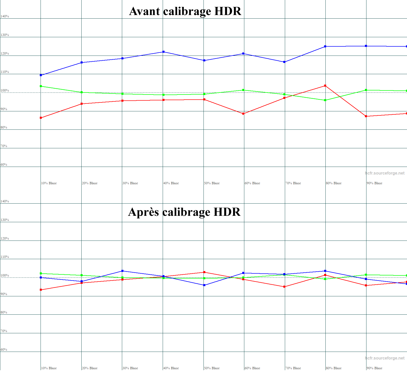 Avant calibrage HDR, la balance des blancs a un excès de bleu. Le pic monte à 140 nits, il en faut 100 minimum en HDR, et le 50% blanc est à 27 nits. Ce qui assure des images suffisamment lumineuses pour les scènes sombres. Le delta E moy est à 6,8 (max 13,4). Pas de blancs brûlés, la courbe de luminance est sous la courbe théorique.