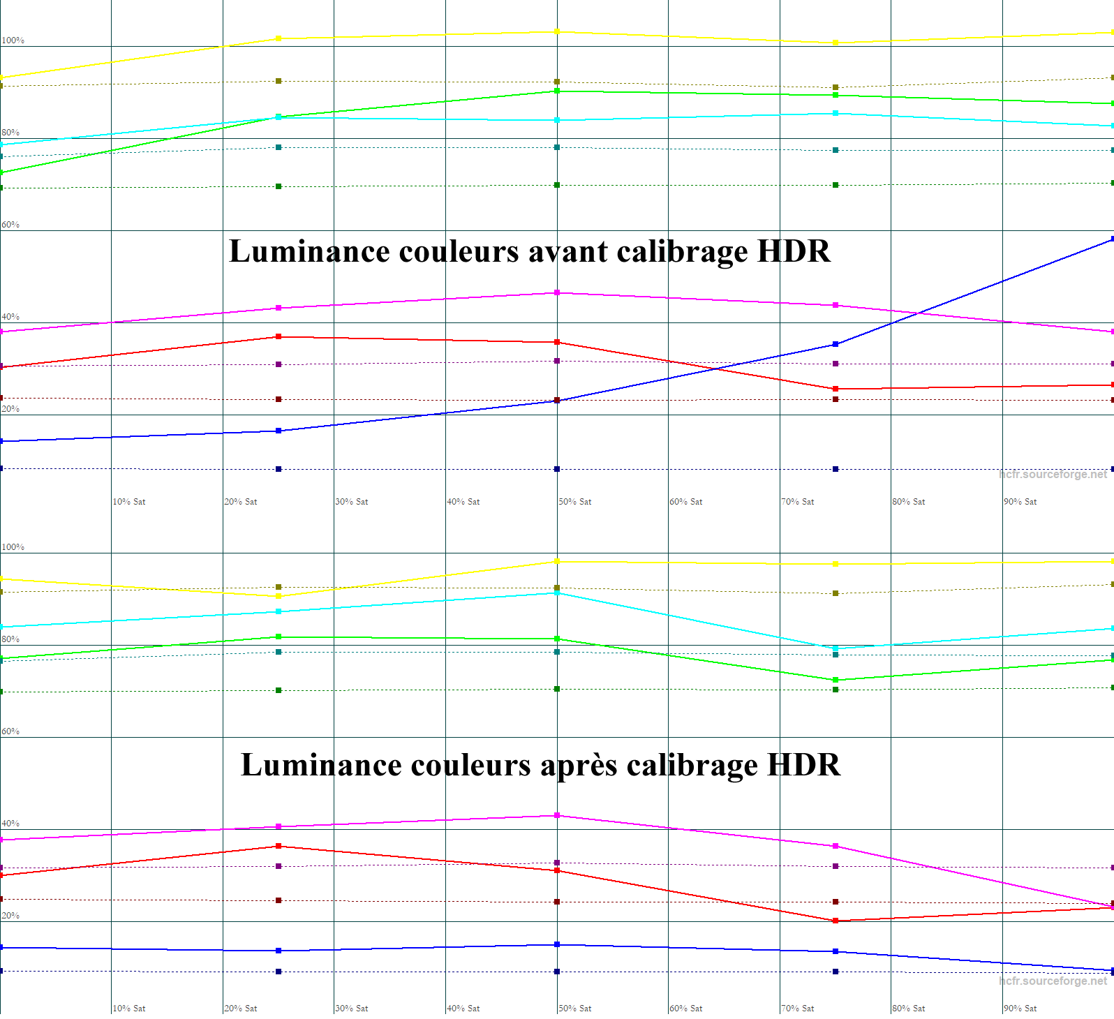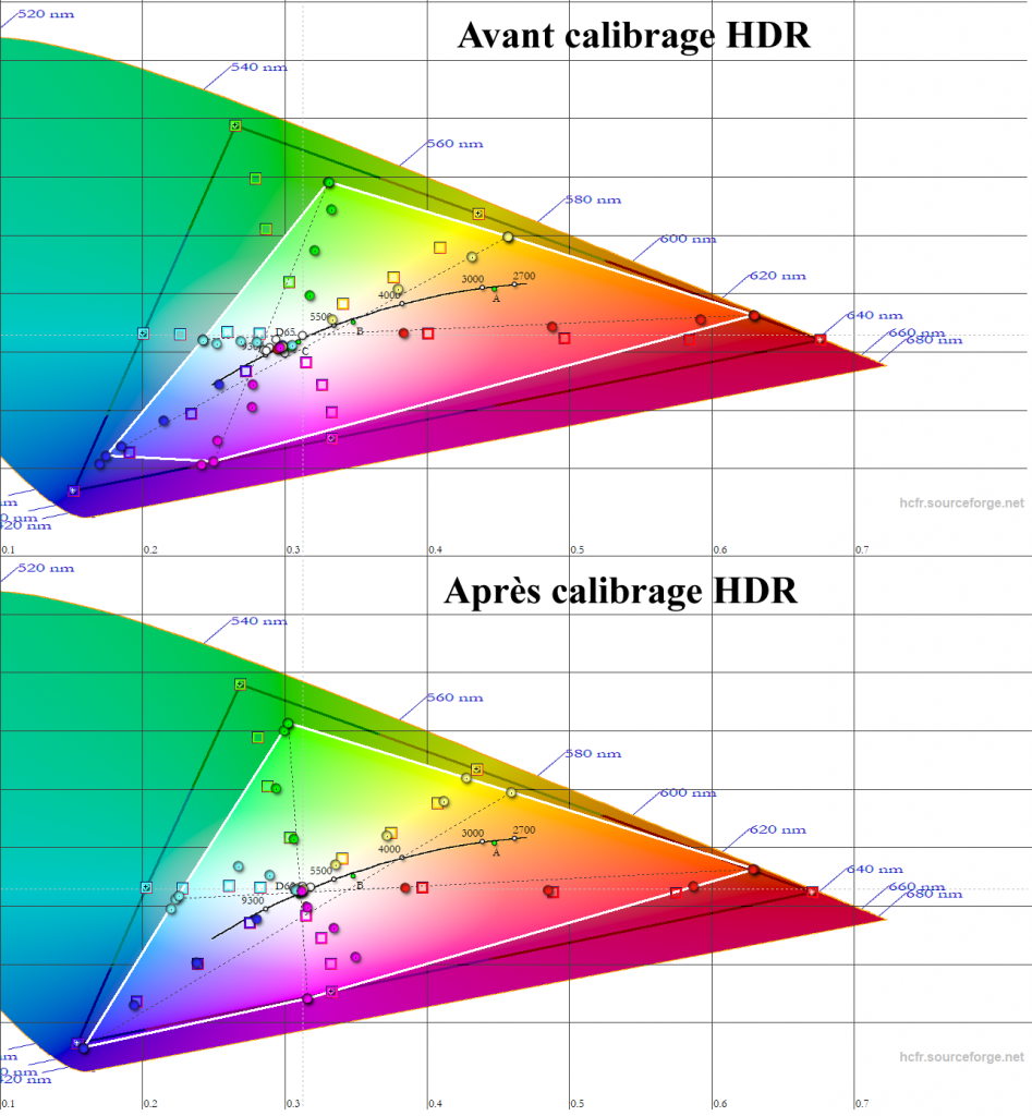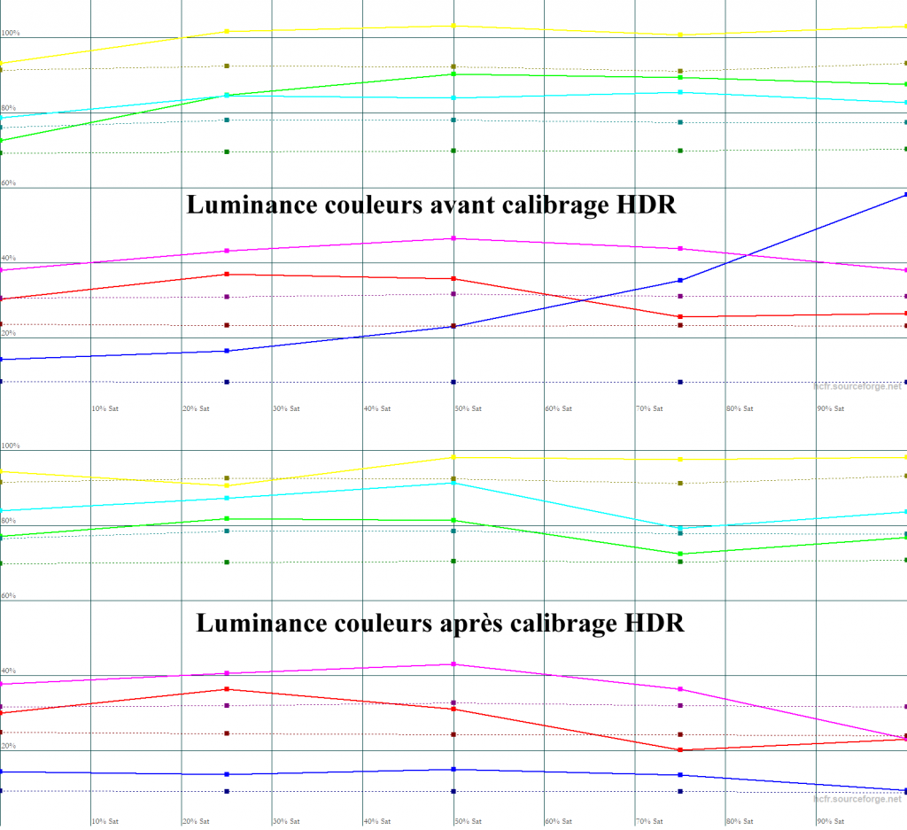 Après calibrage HDR, les couleurs s’améliorent ainsi que la couverture du gamut qui, ici, dépasse un peu le REC709, mais n’atteint pas le DCI-P3. On a également des dérives de teintes dans la saturation, ici pour le cyan et le magenta. Le delta E moy est à 3,1.