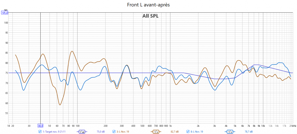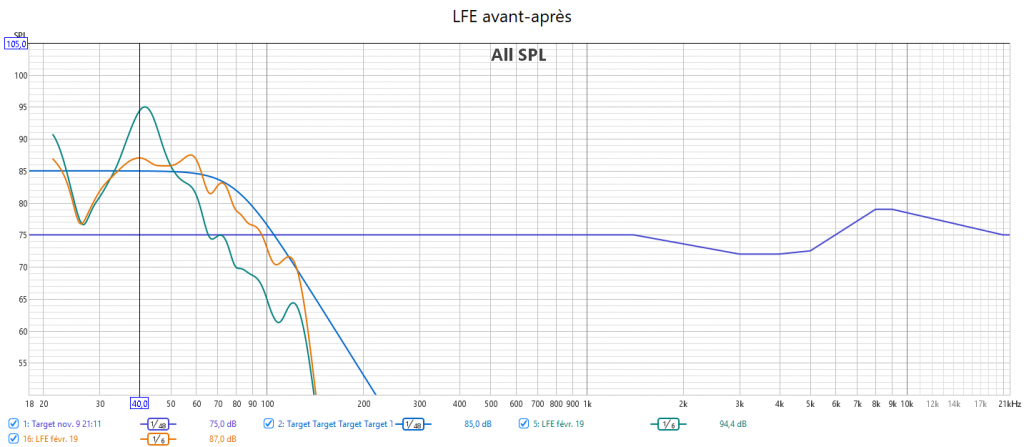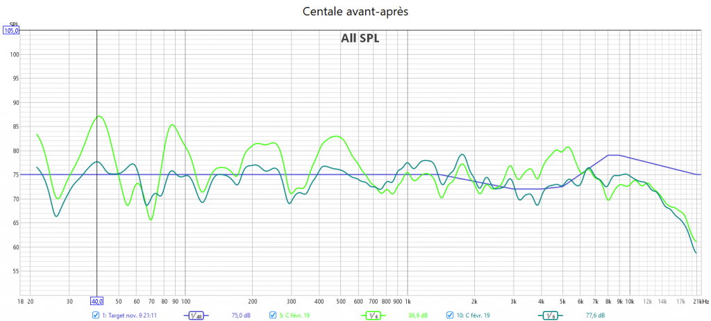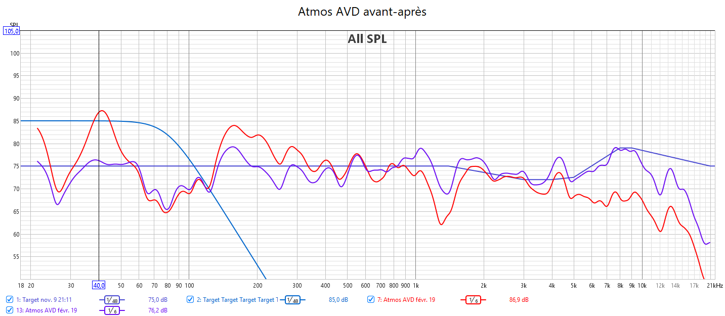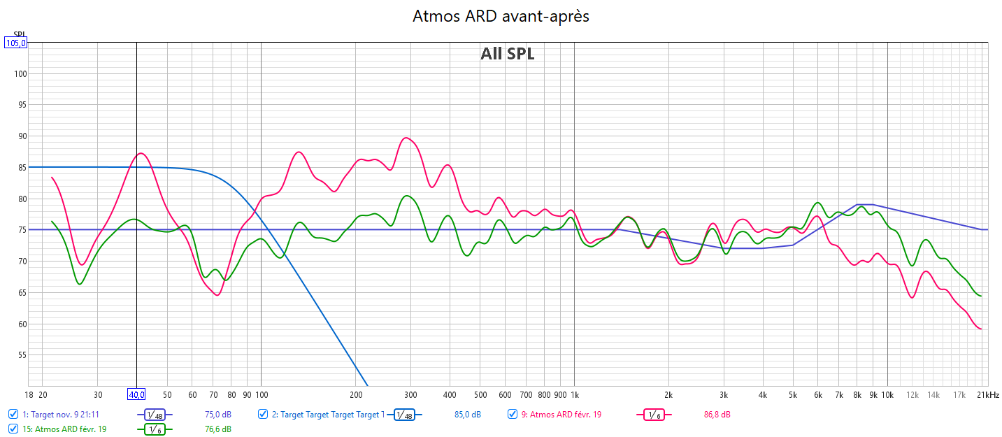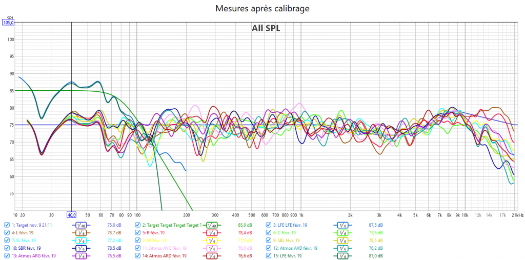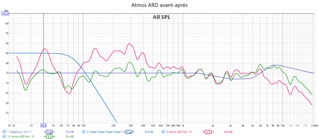 Après calibrage : le calibrage s’est effectué avec une nouvelle courbe cible qui prend en compte la sensibilité de l’oreille suivant les courbes isosoniques. Le premier constat est l’alignement des niveaux qui permet une bonne bulle sonore équilibrée. La réponse des enceintes suit au mieux la nouvelle courbe cible. On notera le gain dans l’extrême aigu (fréquences non agressives). L’alignement du grave n’a pas été simple puisque les 2 caissons sont vraiment différents. Il a fallu inverser la polarité de l’un des 2. Le SVS a bénéficié des filtres de son application. On profite d’un room gain à 20 Hz que je conserve pour le ressenti physique.