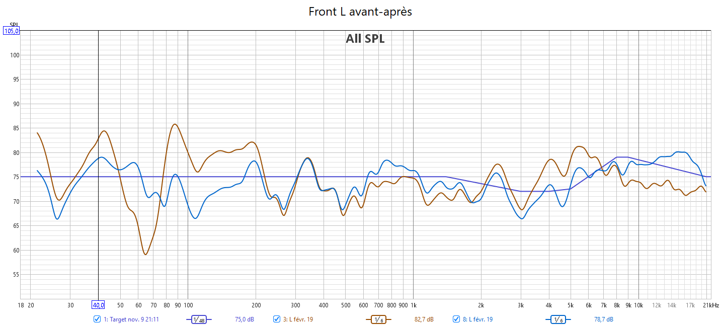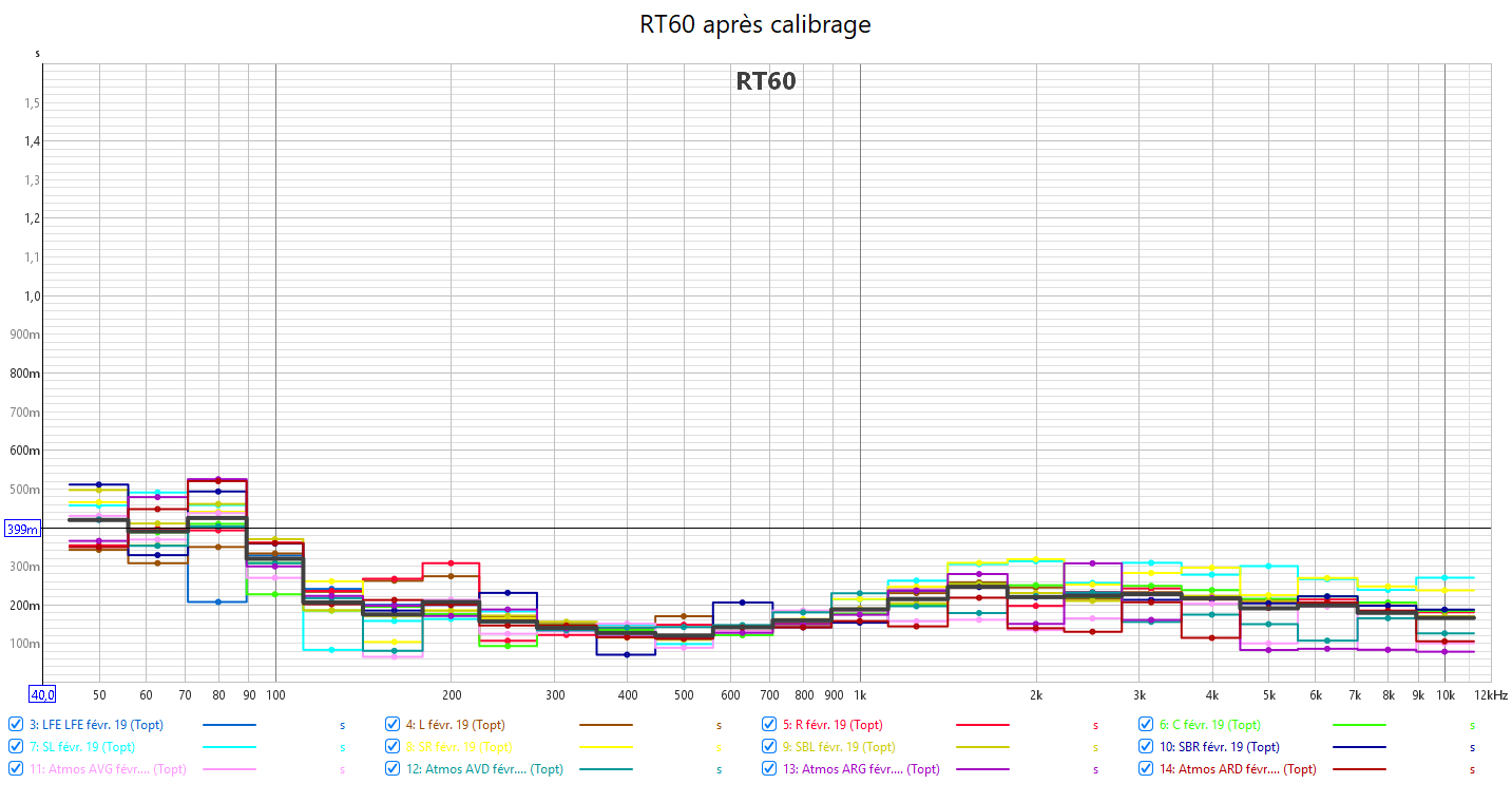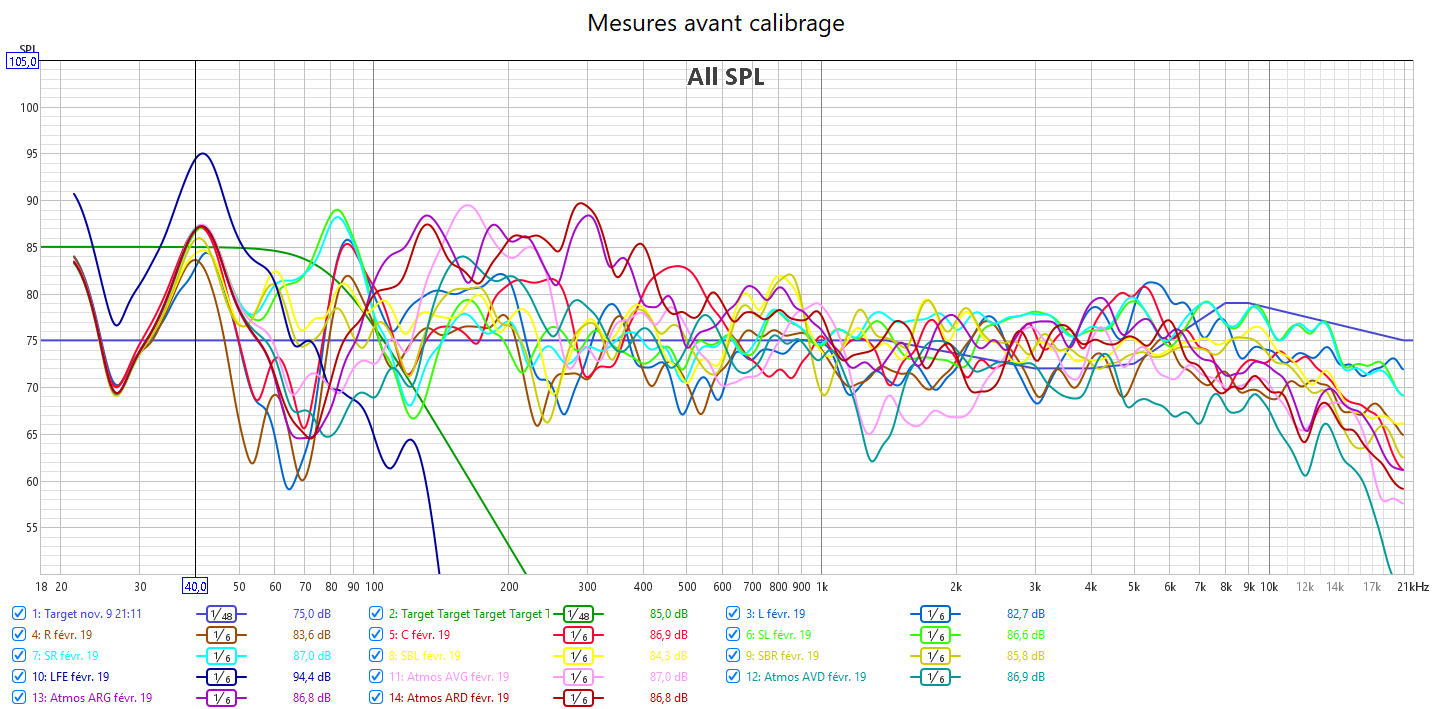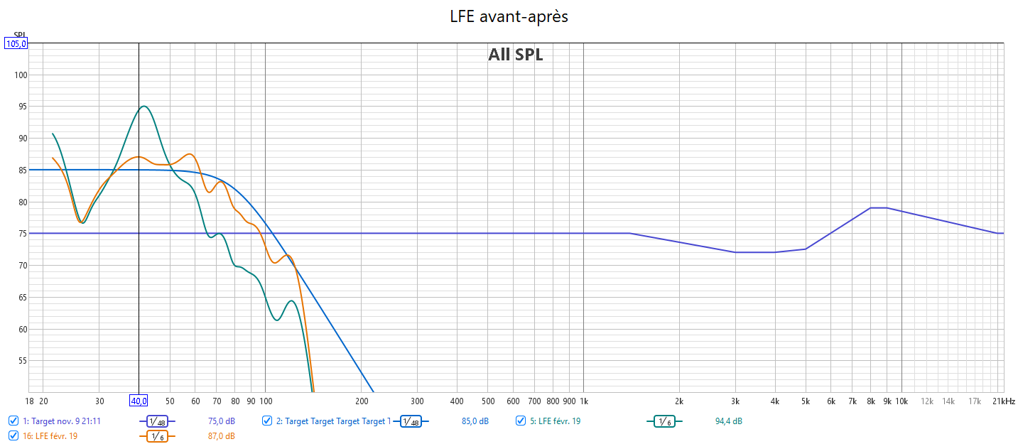 Après calibrage : le calibrage s’est effectué avec une nouvelle courbe cible qui prend en compte la sensibilité de l’oreille suivant les courbes isosoniques. Le premier constat est l’alignement des niveaux qui permet une bonne bulle sonore équilibrée. La réponse des enceintes suit au mieux la nouvelle courbe cible. On notera le gain dans l’extrême aigu (fréquences non agressives). L’alignement du grave n’a pas été simple puisque les 2 caissons sont vraiment différents. Il a fallu inverser la polarité de l’un des 2. Le SVS a bénéficié des filtres de son application. On profite d’un room gain à 20 Hz que je conserve pour le ressenti physique.
