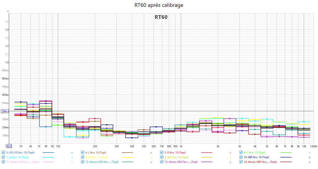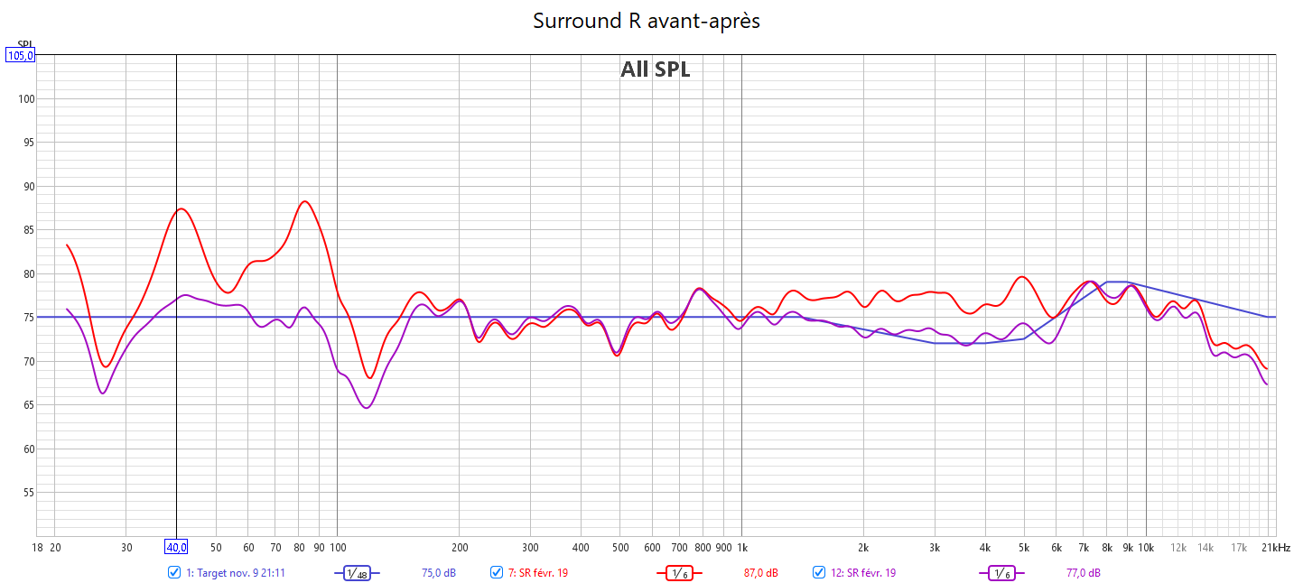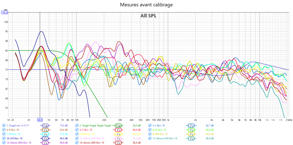 Avant calibrage : pour un système déjà calibré par un pro, il y a beaucoup de différences entre les niveaux de chaque canal et les réponses en amplitude sont assez différentes. La bulle sonore manque d’équilibre. La frontale droite est un peu en retrait et l’agressivité perçue pendant le test d’avant calibrage vient principalement de la centrale et de la frontale gauche. Leur plage de fréquence de 4 à 6 kHz (zone sensible de l’oreille) est bien trop haute. C’est aussi le cas pour les surrounds droite et gauche, mais leur exploitation dans la scène sonore étant moindre, leur agressivité est moins flagrante.
