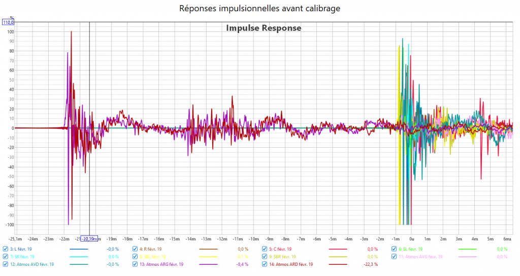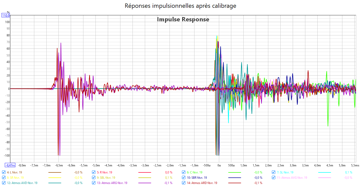 Avant calibrage , l’alignement temporel des enceintes (réglage des distances) se situe dans une fourchette d’1 milliseconde. C’est bien, sauf pour les atmos AR qui sont en avance de plus de 20 ms. Les distances sont bien renseignées. Il s’agit d’un bug du préampli Yamaha.