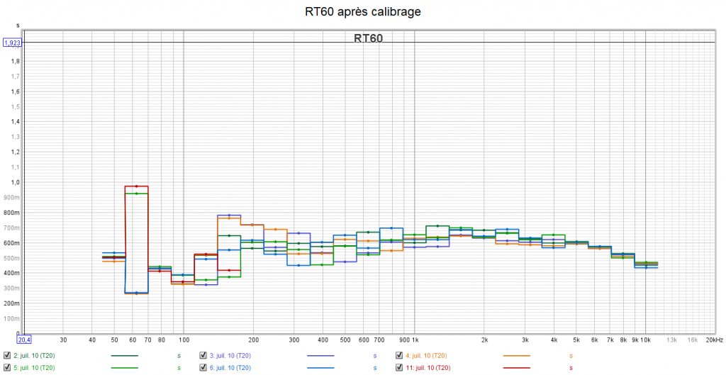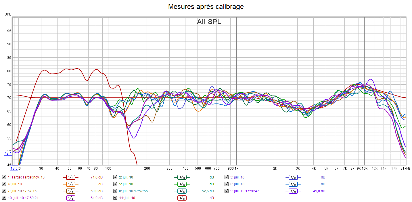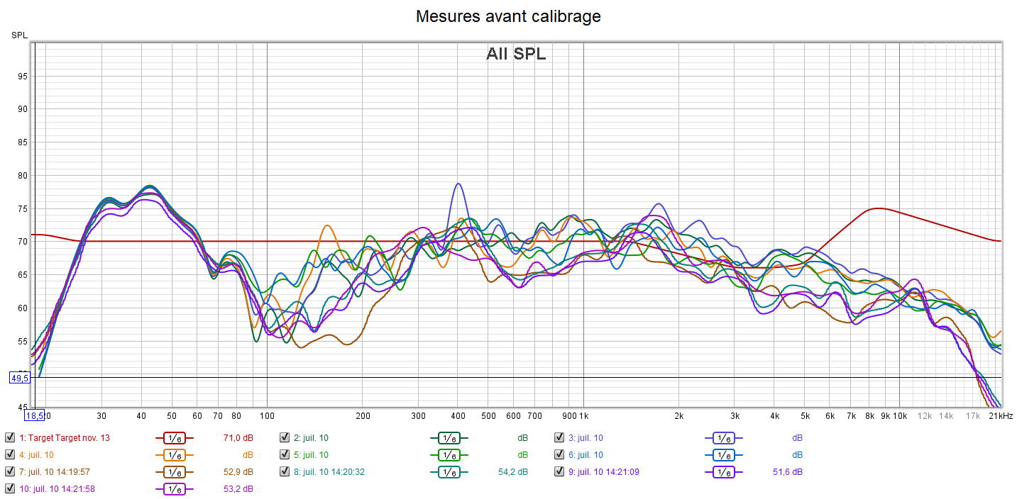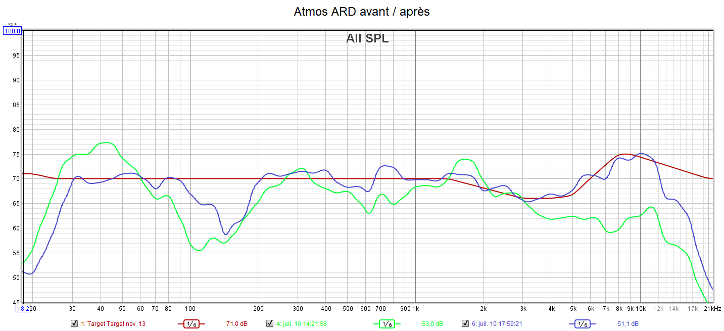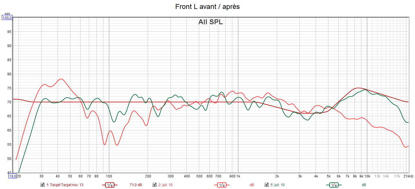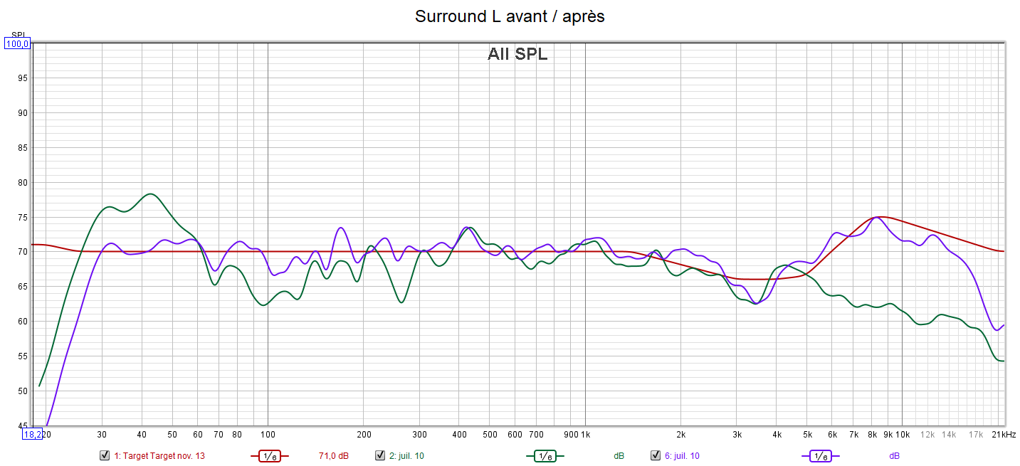 Ci-dessous la correction de la frontale gauche, la centrale, l’atmos arrière droite et la surround gauche. Les crossover sont nettement mieux, mais un manque persiste pour les atmos car les Waterfall Audio Serio coupent à 180Hz.