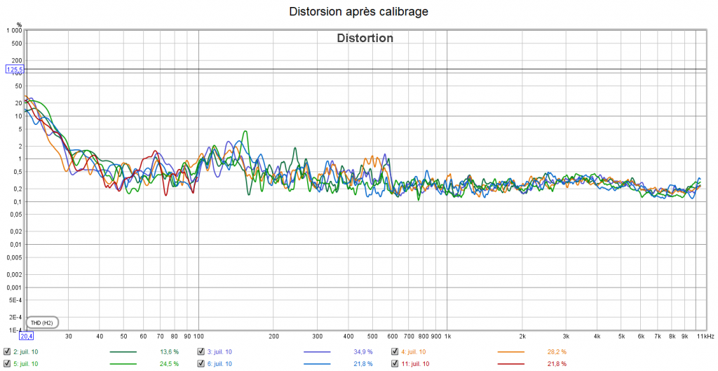Après calibrage, La distorsion s’améliore nettement en accordant le mieux possible les crossover entre les enceintes et le caisson sur la plage 100 – 200Hz.