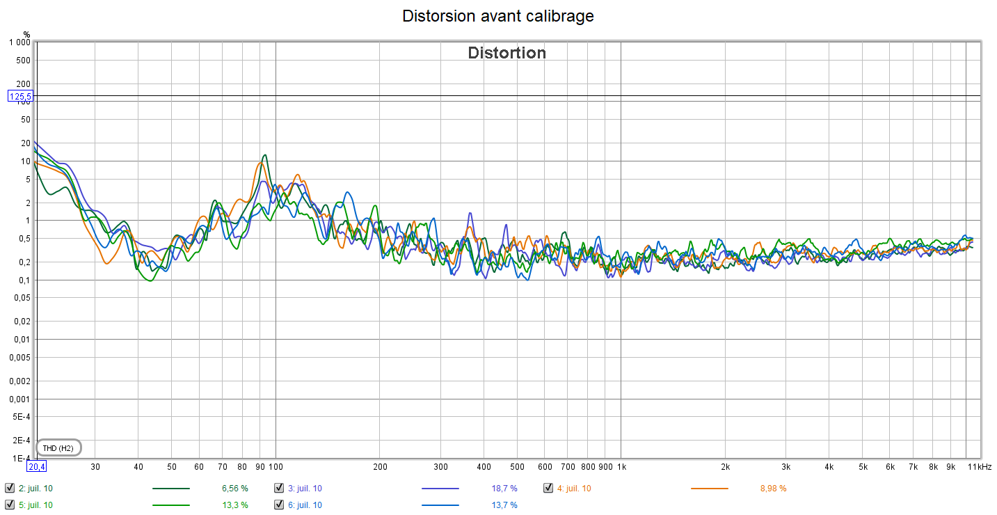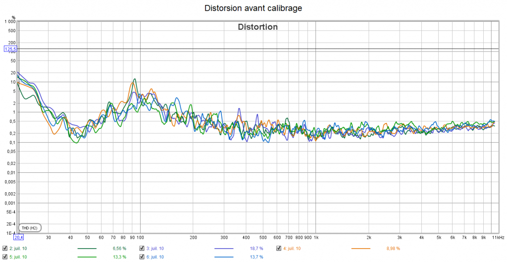 Le pic de distorsion à 100Hz avant calibrage vient du mauvais crossover entre les enceintes et caisson. La bande passante du caisson est trop faible.