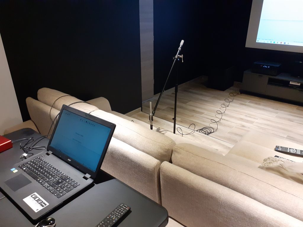 Pour ce calibrage du Yamahe RX-A1080, toutes les enceintes sont des Jamo D500. Le caisson est un Klipsch. Le tout en pièce dédiée.