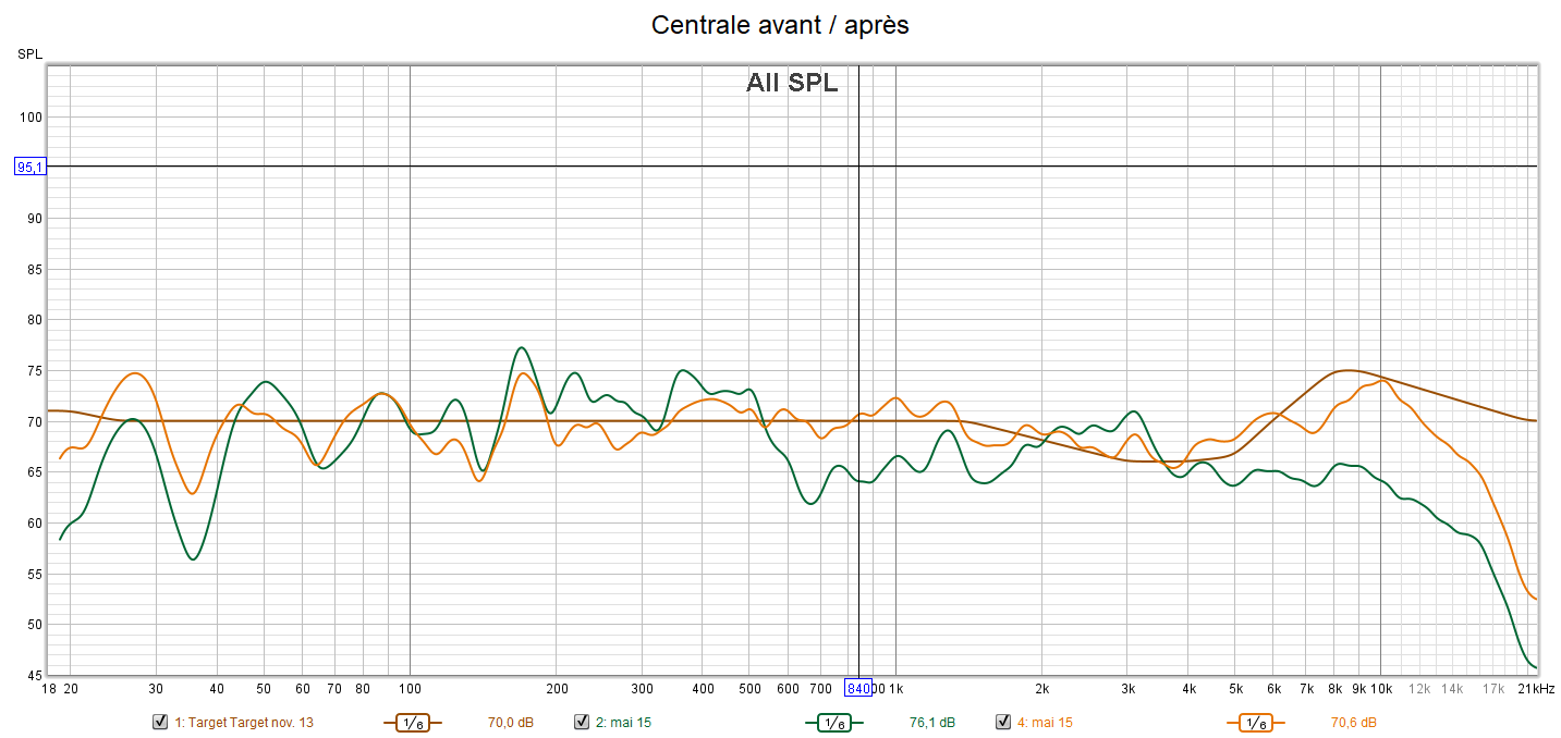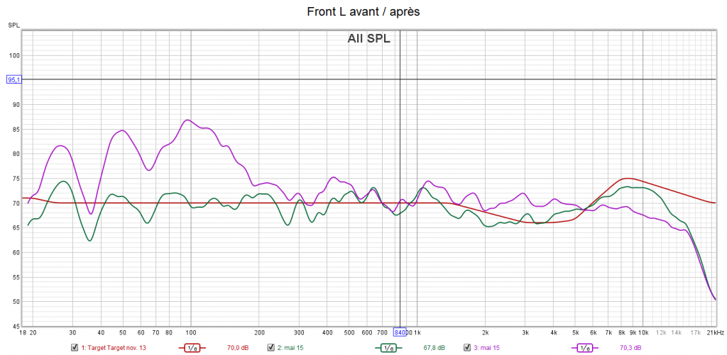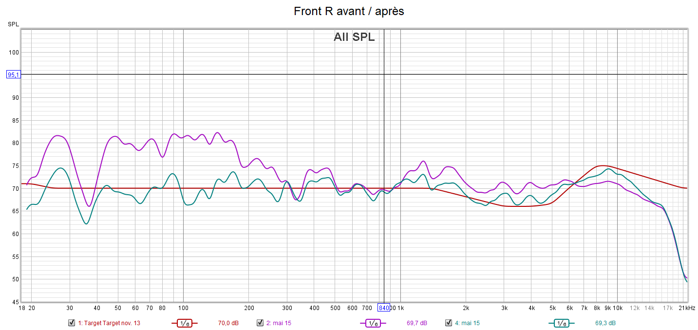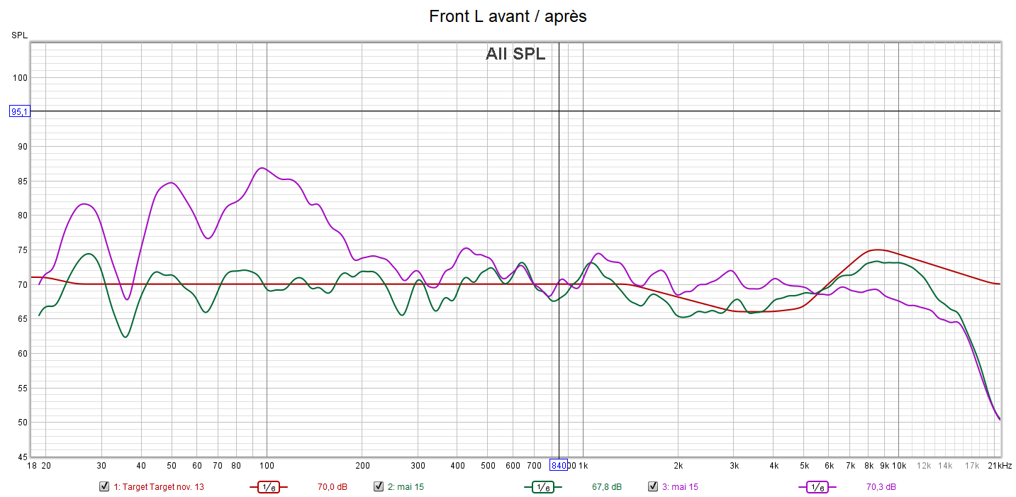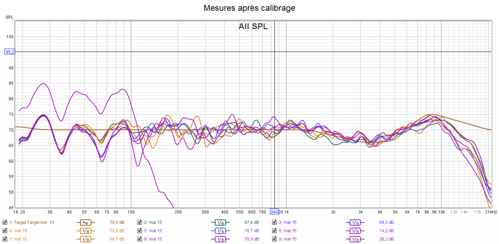 Après calibrage, la réponse dans le grave est lissée au maximum en utilisant les égaliseurs paramétriques (PEQ) de l’ampli. Idem pour la réponse des enceintes toutes coupées à 80 Hz. Les aigus sont baissés et les extrême aigus relevés pour coller à la courbe cible. On gagne en clarté, en détails, en localisation et donc en spatialisation du son. Les niveaux des canaux sont ajustés à 75 dB. Toutes les enceintes ont la même réponse avec le même niveau sonore garantissant une homogénéité du son et donc une bulle sonore optimisée. Ainsi, un bruit tournant passant d’une enceinte à une autre devient plus fluide avec un minimum de différence sonore.