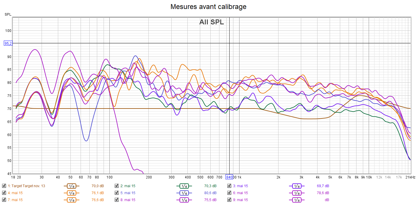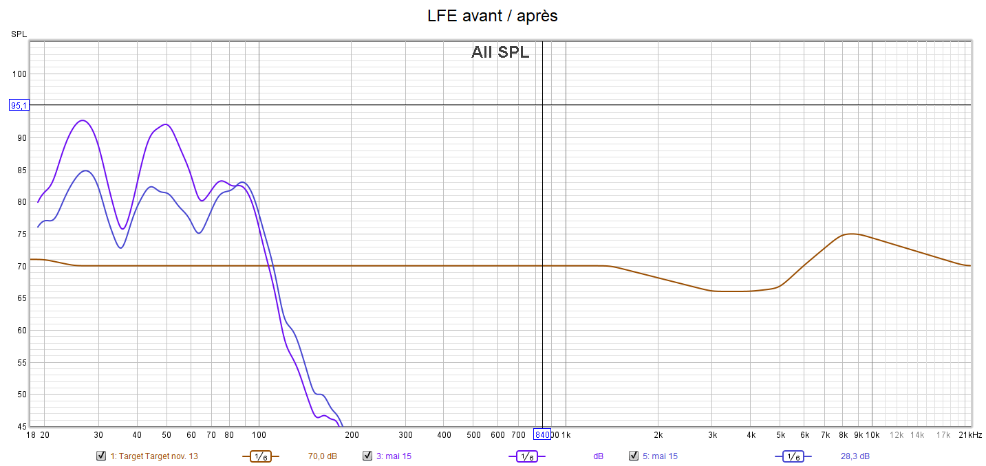 Les mesures avant calibrage montrent une disparité dans les niveaux des différents canaux. Les graves manquent de linéarité. Il y a un manque d’audibilité des surrounds et des détails, un manque de clarté. Pour le calibrage, la courbe cible sera donc modifiée suivant une extrapolation des courbes isosoniques Fletcher et Munson qui prend en compte la sensibilité de l’oreille.