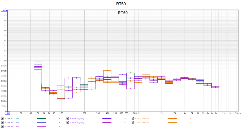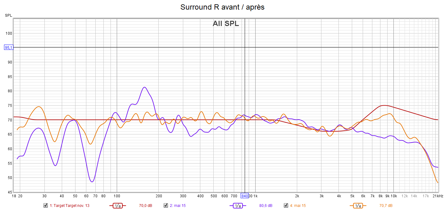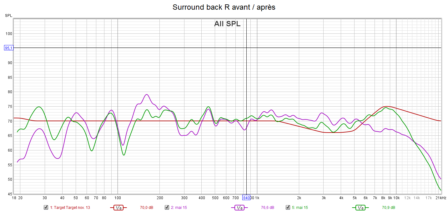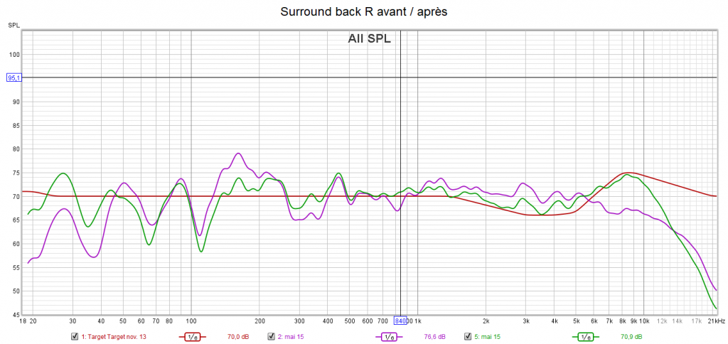 Ci-dessous la correction des canaux Front L et R, Centrale, Surround R, Surround Back R et LFE. Jusqu’à 9dB de correction sur certaines fréquences. La différence est audible immédiatement après le calibrage.