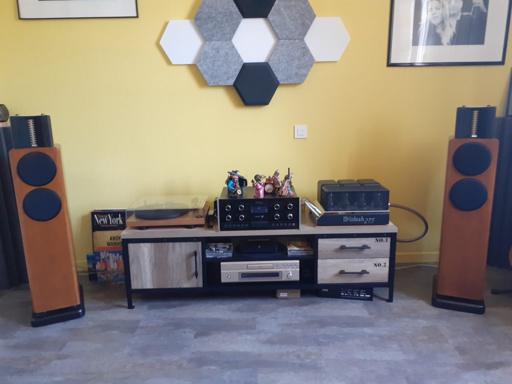 Calibrage son 2.0 sur un système d’écoute composé d’un préamplificateur McIntosch MX130 et d’un amplificateur McIntosch à tube MC 275. La source principale est un streamer Bluesound Node qui envoie son contenu en numérique à un DAC Atoll DAC300. Configuré en by-pass, il envoie le signal analogique au préampli. Les enceintes sont des enceintes artisanales de très bonne facture provenant de la Maison Du HP de Toulouse dont le rendu est déjà très bon dans cette pièce d’écoute dédiée avec une acoustique maîtrisée.