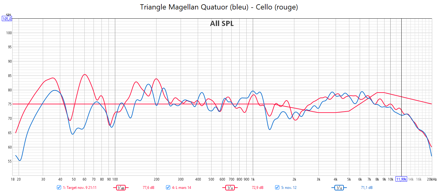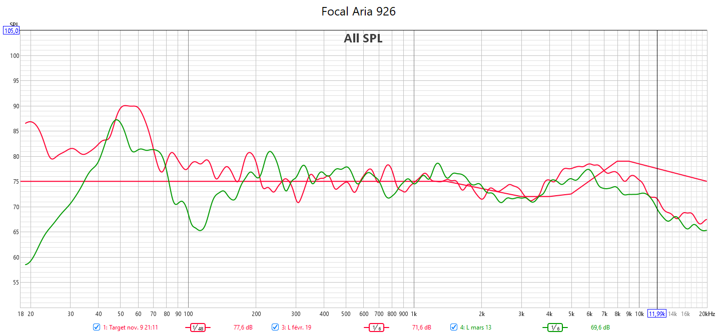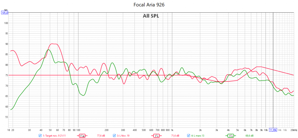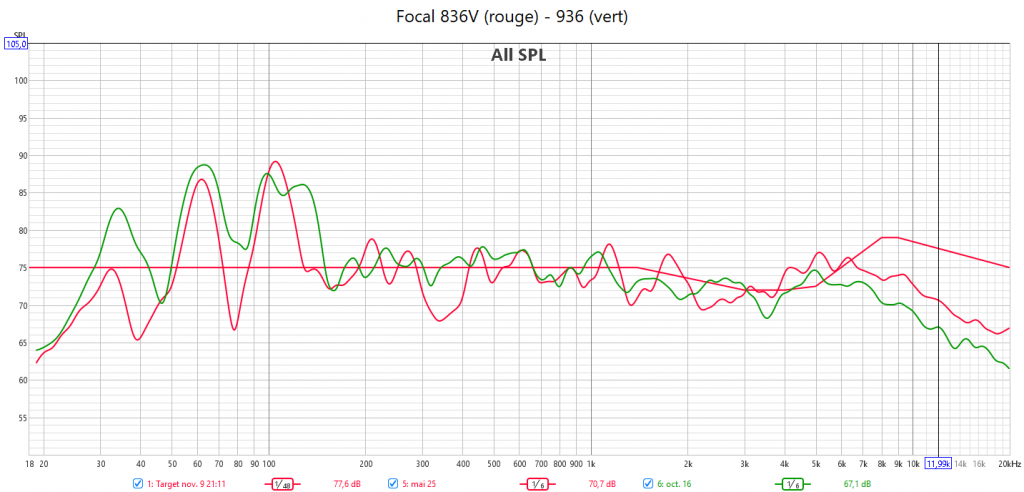 Chaque pair d’enceinte avait un rendu différent lié principalement à leur tonalité, à leur timing et l’acoustique de la pièce. Elles ont chacune leurs particularités. On peut constater des gestions différentes dans l’aigu générant de l’agressivité ou pas. L’extrême aigu (au-dessus de 6 kHz) n’est pas à négliger. Ce sont des fréquences non agressives extrêmement importantes pour le naturel du rendu, pour l’ouverture de la scène sonore, pour le placement, pour la clarté, en home cinéma comme en HiFi. Si l’ampli le permet, désactiver et réactiver le calibrage en pleine écoute pour obtenir une réponse proche de la courbe cible permet de pleinement se rendre compte du gain important que procure la présence de l’extrême aigu et aussi, la maîtrise de l’agressivité. Pouvoir basculer en une seconde d’une configuration sonore à une autre est la façon la plus efficace d’effectuer un comparatif objectif.