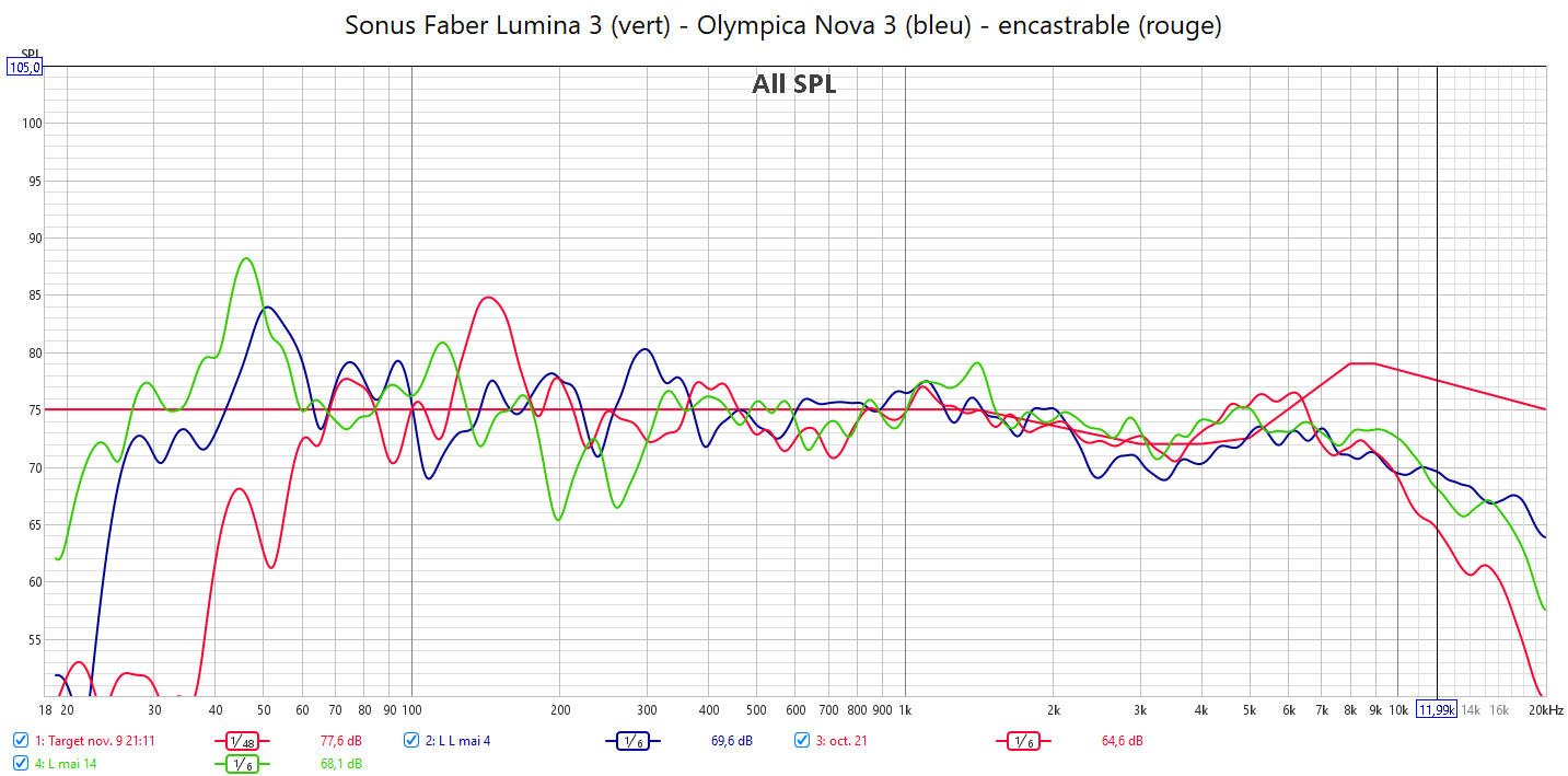 En passant de home cinéma en home cinéma, je cumule pas mal de mesures d’enceintes associées à beaucoup de matériels différents (les amplis se veulent neutres et pour ceux déjà testés, ils ne changent pas la tonalité d’une enceinte). Bien que les mesures soient effectuées dans des pièces pouvant altérer la réponse des enceintes, au dessus de la fréquence de Schroeder (environ 150 à 300 Hz en fonction des pièces), on s’approche de la réponse naturelle des enceintes. Et quand bien même, des mesures en situation réelle sont plus parlantes qu’en chambre anéchoïque.