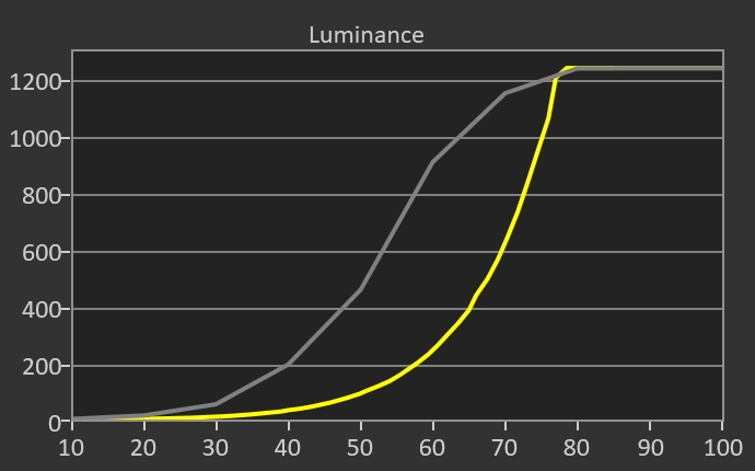 Voici un exemple d’un mode HDR qui peut faire office de mode « jour », car les luminances mesurées sont nettement au-dessus de la norme ST2084. Le 50% est à 460 nits au lieu de 94 nits. Le problème est que les détails lumineux vont se fondre dans la haute luminosité global des images bridant totalement le rendu HDR recherché. Les images ne seront plus fidèles aux choix artistiques voulus en studio. On se rapproche grandement d’un rendu SDR très lumineux.