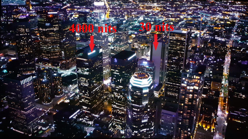 Si on augmente le pic de luminance, en SDR, c’est la luminosité de toute l’image qui augmente. Pas en HDR. Les points à basse luminosité n’ont pas bougé par rapport au pic précédent à 1000 nits. C’est le pic des détails lumineux qui a augmenté pour donner des images encore plus proches de la réalité.