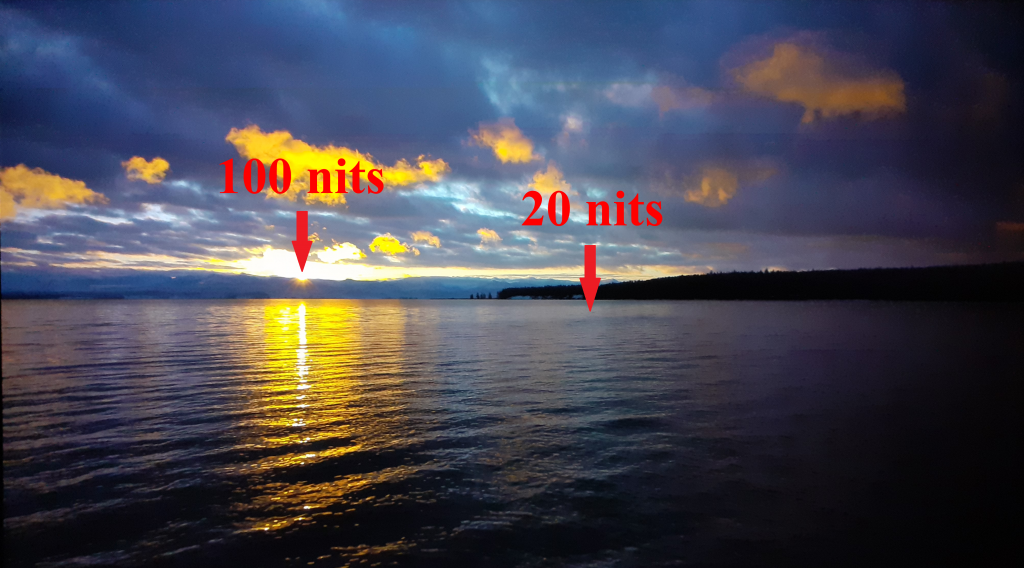 – Pour compenser un HDR trop sombre par rapport au SDR, vous allez choisir le mode HDR « jour » (si disponible) ou vouloir augmenter la luminosité par un autre moyen, ce qui ne vous permettra pas de bénéficier du meilleur rendu HDR puisqu’en relevant le 50%, l’écart avec les pics lumineux est réduit : la plage dynamique utile est réduite. De plus, il y a un risque de brûler les blancs.